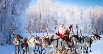 “Santa Claus rides a sleigh with nine reindeer.”